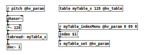 (2)はdrumlogue用に導入した、Pure Dataのテーブルにlogue SDK側からPCMデータを書き込む機能のNTS-1 mkII版です。logue SDKのオシレータでは、90種類のウエーブテーブルが用意されており、その中から任意の波形をこの機能を使ってPure Data側のテーブルにコピーすることができます。