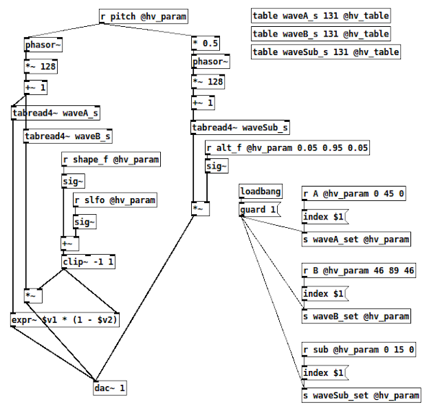 元のPure Dataパッチはこちら。右上あたりで3つのテーブルを作成しています。テーブルのサイズが131なのは、補間機能を使うためです。(実データの直前に1つ、直後に2つのサンプルが必要。)あとはそれを[phasor~]で読みだしてミックスしているだけです。