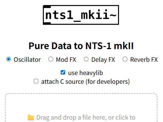 前回紹介した、Pure Data→logue SDK変換ツール(hvccのexternal generator)のNTS-1 mkII対応をWebアプリ化しました。基本的には、logue SDK v1用のWebアプリを拡張して、ディレイ等の複数のタイプのユニットに対応させたものです。