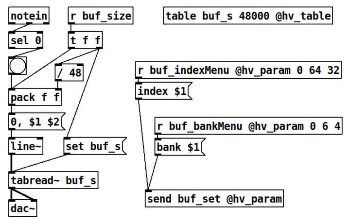 Sample audio data on drumlogue can be copied to a table whose name ends with “_s” and has the third argument @hv_table. The table can be used with [tabread~] and [tabread4~].